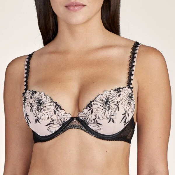 Le soutien-gorge push-up Poétique esquisse Aubade vient rapprocher la poitrine et offre un bombé sensuel. Les coussinets push-up apportent un volume supplémentaire à la poitrine. Les armatures rehaussent la poitrine et laisse place à une ouverture au niveau de l’entre-bonnet décoré d’un tulle plumétis. Un tulle fin surplombé de jolies fleurs brodés s’étendent sur les coques. Les bretelles bicolores décorées d’une broderie fantaisie ornent les épaules avec charme, agrémentés de petits nœuds satinés. Le tour de taille est entièrement confectionné en tulle plumétis apportant à la fois une transparence sexy et l’élégance de ce motif.