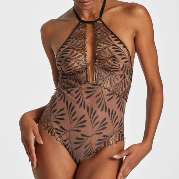 Le body Sensory Illusion Aubade est l’une des plus belles pièces de la collection Sensory Illusion. Le bijou en or en forme de U accentue le décolleté profond, ajoutant de l’éclat à la pièce et dégageant un glamour inégalé. La pièce est façonnée pour accentuer les hanches, avec des échancrures sur les côtés. La laize transparente rend le body particulièrement sexy, révélant la couleur de la peau derrière les motifs floraux contrastant à travers les couleurs vibrantes de la collection. Le dos est rehaussé d’une ouverture, dévoilant une partie du dos. Un élastique noir attaché autour du cou en finition du body vient rajouter la touche raffinée de cette pièce.